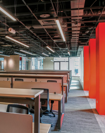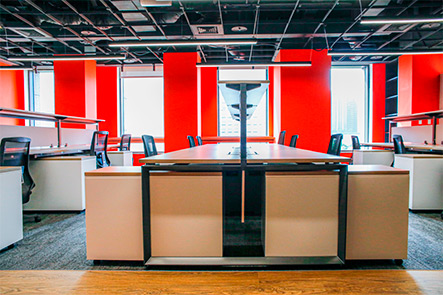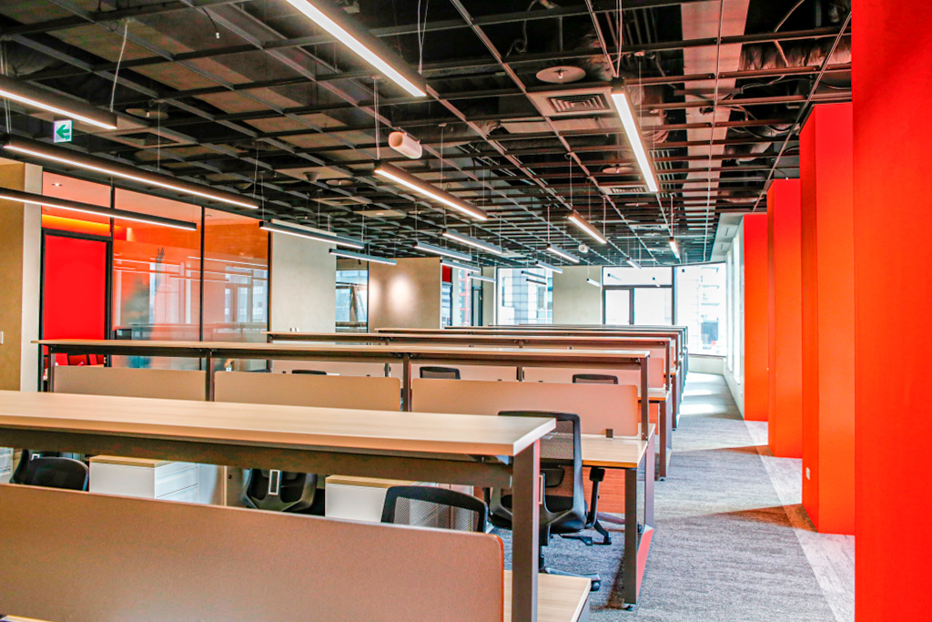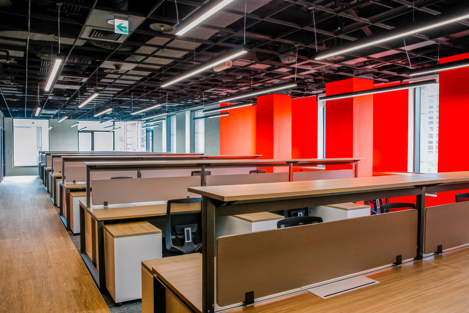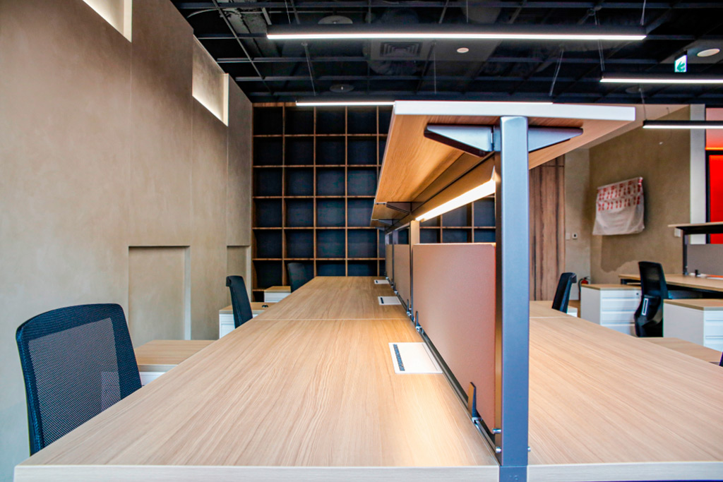 呼應國際工程顧問公司實事求是的企業文化,此處的系統家具採用結構外露、線條剛毅的設計語彙。其沈穩的木紋色調,與空間中大膽的品牌紅色柱體形成完美平衡,共同構建出既具備理性秩序,又不失人文溫度的專業辦公場域。